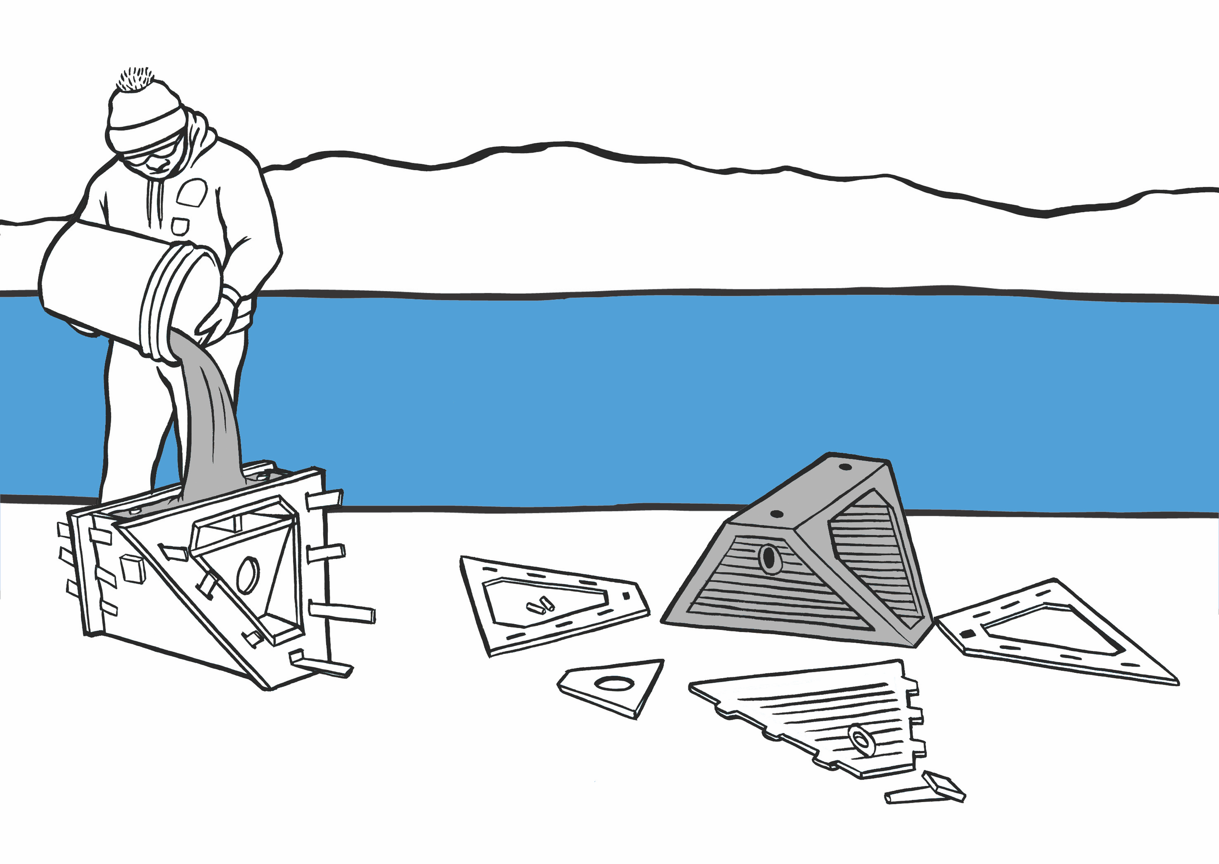 The oyster reef elements are fabricated to interlock. Although they are currently being prototyped as units made from four elements, they can be expanded horizontally and vertically in the future to create larger reef systems.
